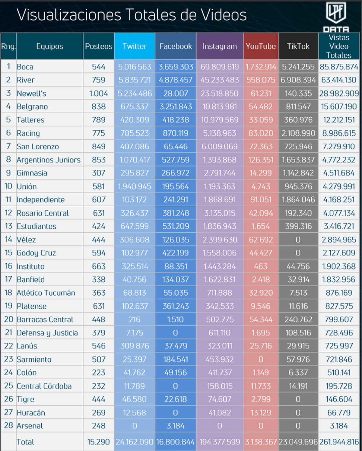 Un informe oficial se conoció este jueves a través de la cuenta de Twitter @LPFData que trata sobre los reportes y análisis del área de datos de la Liga Profesional. Boca Juniors es el equipo que más seguidores tiene en todas las redes sociales.
