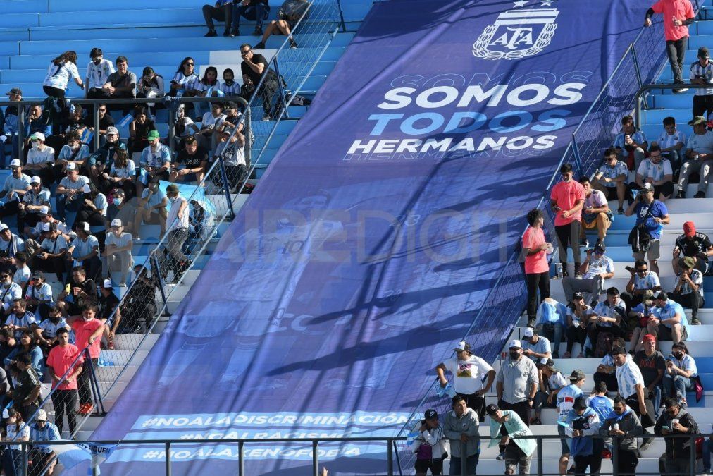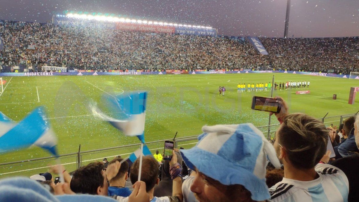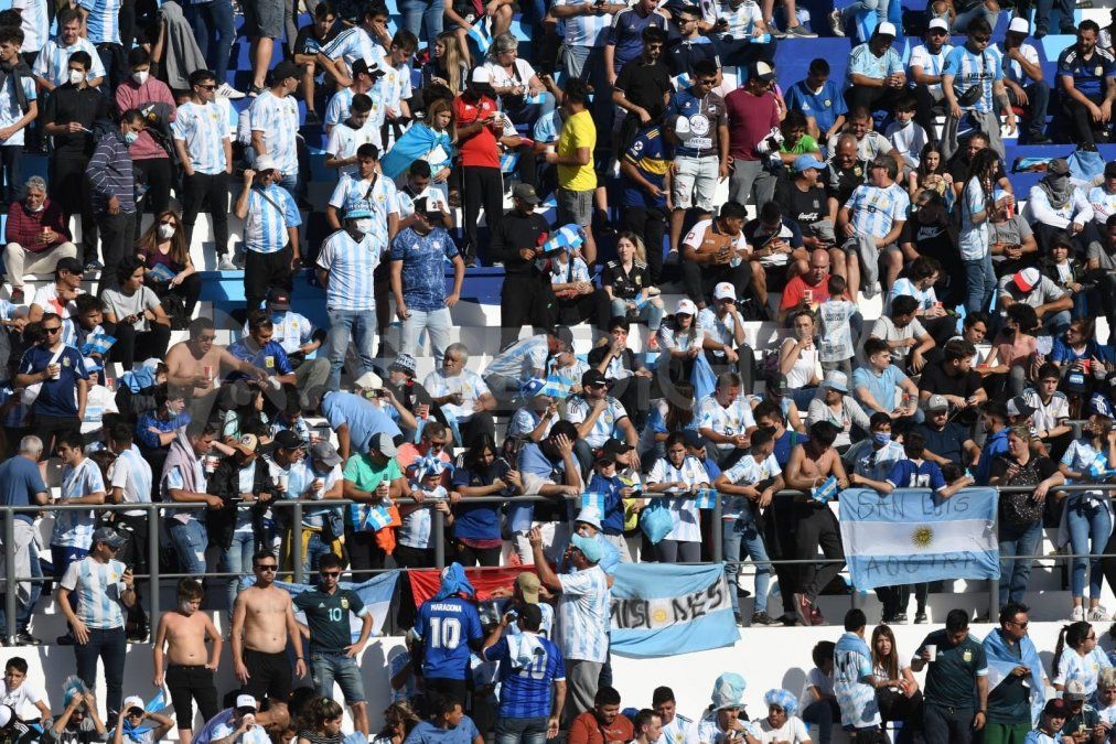 La Selección Argentina juega ante Brasil por las Eliminatorias Sudamericanas y el público local no quiso perderse el encuentro en el Estadio Bicentenario de San Juan. Luego de agotar las 25.000 localidades disponibles, los hinchas argentinos le aportaron color al clásico sudamericano.