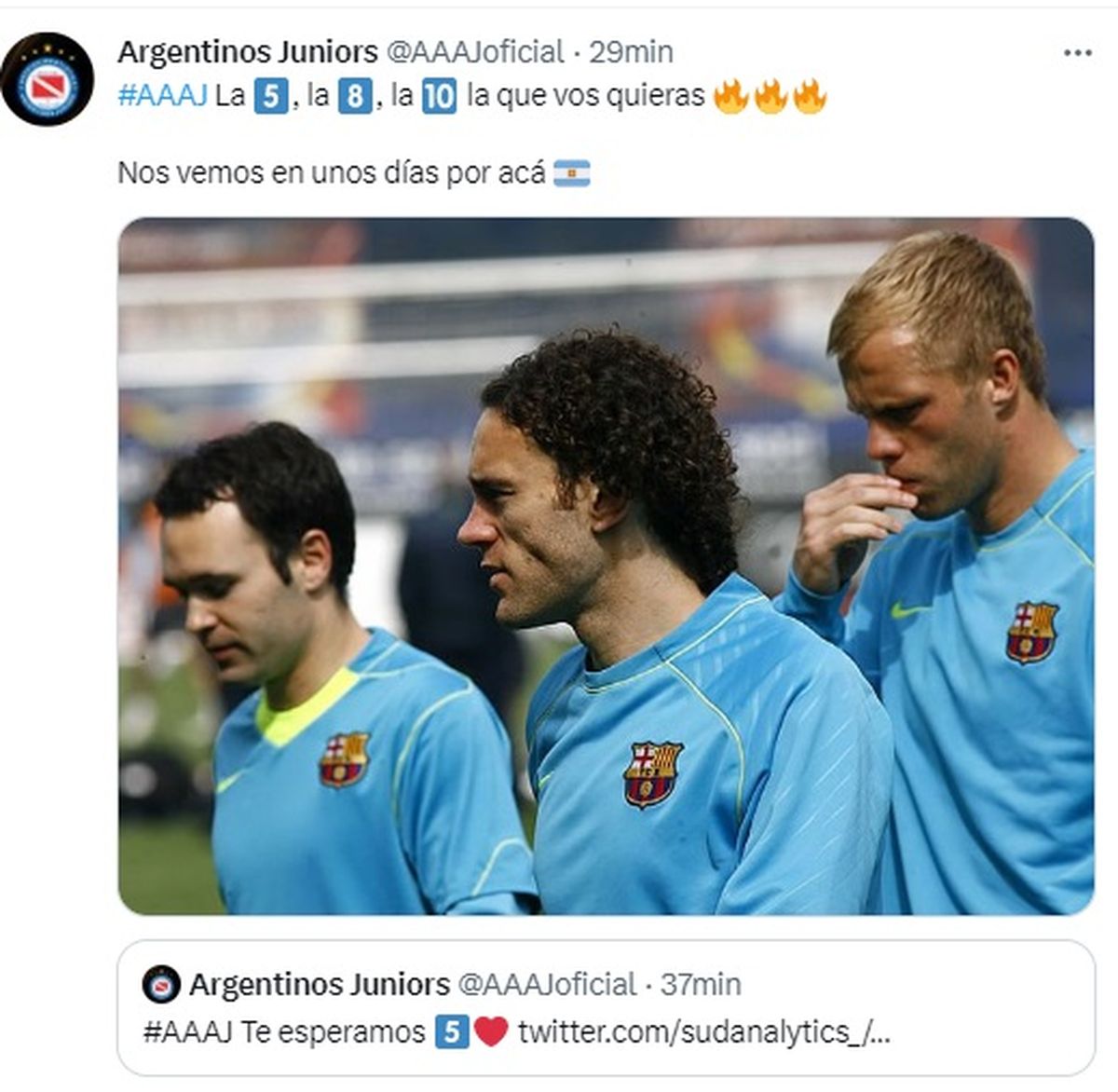 "Te esperamos", publicó Argentinos en su cuenta de Twitter acompañando una foto de su entrenador cuando era compañero de Iniesta en el Fútbol Club Barcelona. Las respuestas no se hicieron esperar y alimentaron todavía más la ilusión de todos los hinchas del Bicho y del fútbol argentino de ver a este genio del fútbol en la Liga Profesional.