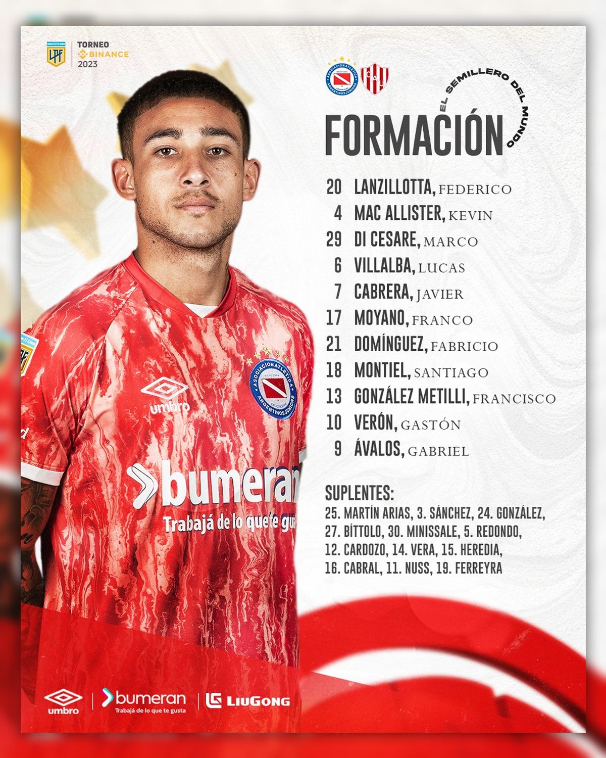 Argentinos Juniors: Federico Lanzillota; Leonel González, Kevin MacAllister, Marco Di Cesare y Fabricio Domínguez, Matías Vera, Federico Redondo, Francisco González Metilli y Leonardo Heredia; Facundo Ferreyra y Rodrigo Cabral. DT: Gabriel Milito.