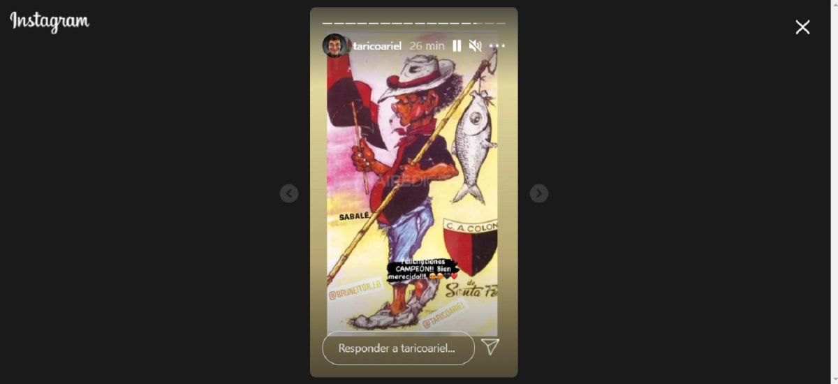 Ariel Tarico, hincha de Colón de Santa Fe, subió a sus historias de Instagram una postal a manera de festejo después de que el conjunto Eduardo Domínguez venciera a Racing en la final de la Copa de la Liga. "Felicitaciones CAMPEÓN!! Bien merecido!!!", expresó el humorista en la imagen.