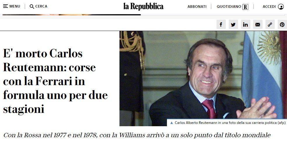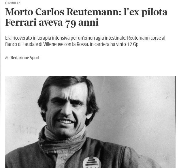 El Corriere Della Sera recordó a Reutemann escribiendo: "El exsubcampeón mundial de Fórmula 1 con Ferrari y exgobernador de la provincia argentina de Santa Fe, Carlos Reutemann, falleció el miércoles 7 de julio a la edad de 79 años. El anuncio lo hizo su hija, Cora Reutemann, con un conmovedor mensaje en su perfil de Twitter".