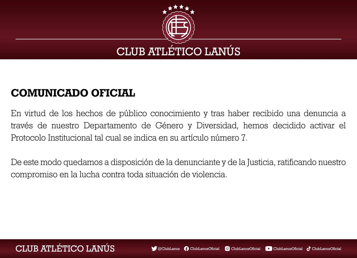 Ante esta situación el club Lanús, donde se eleva una estatua del futbolista, emitió anoche un comunicado al respecto: "En virtud de los hechos de público conocimiento y tras haber recibido una denuncia a través de nuestro departamento de Género y Diversidad, hemos decidido activar el protocolo institucional tal cual se indica en su artículo número 7. De este modo quedamos a disposición de la denunciante y de la Justicia, ratificando nuestro compromiso en la lucha contra toda situación de violencia".