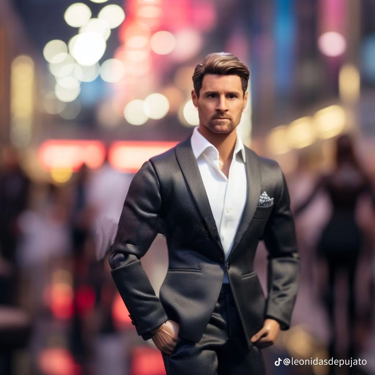 Lionel Messi se muestra como un muñeco bronceado, con una leve barba en su mandíbula y un traje de color claro, destacándose de sus compañeros. En cambio, Lionel Scaloni luce una camisa azul sencilla.