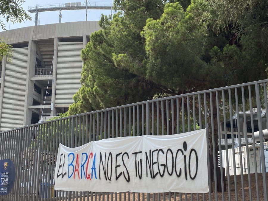 "El Barca no es tu negocio"; "Laporta judas engañaste a D10S", "Laporta lacayo de Florentino"; "Laporta Mentiro$o" y "Messi en París, tú en Ibiza", son algunas de las leyendas que se podían leer en las inmediaciones del estadio en la previa del duelo con Real Sociedad, que fue victoria por 4 a 2.