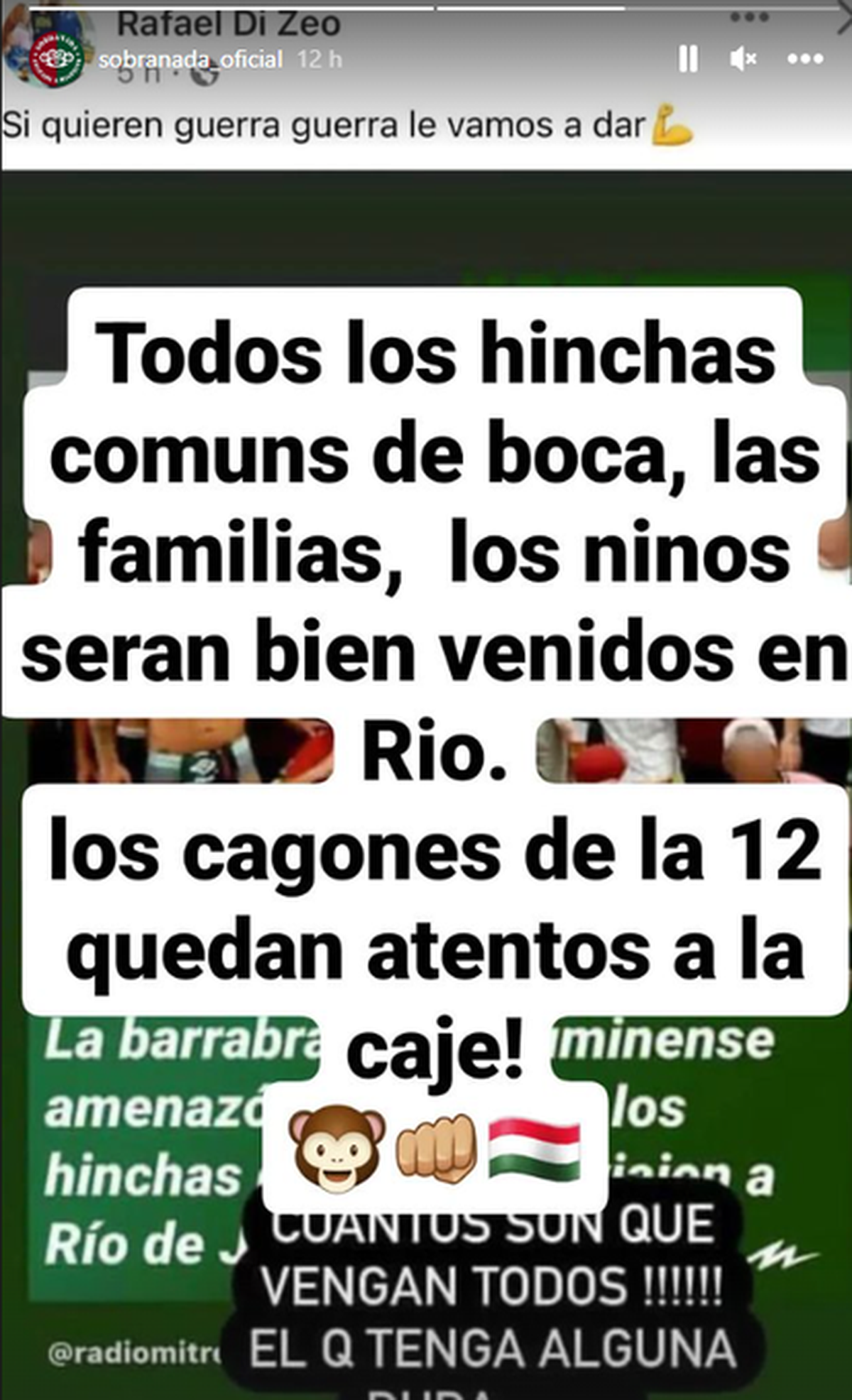 También publicaron en su cuenta de Instagram un mensaje amenazante, citando un posteo del líder de la 12 Rafael Di Zeo, en el que aseguran que "todos los hinchas comunes de Boca, las familias y los niños van a ser bienvenidos en Río, pero los cagones de la 12 quedan atentos".