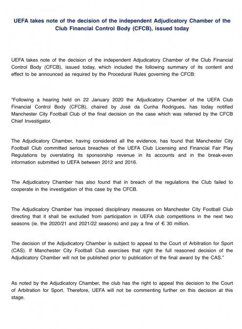 "La Sala de Adjudicaciones, después de considerar todas las pruebas, descubrió que el Manchester City Football Club cometió graves infracciones del Reglamento de Licencias Financieras y Juego Limpio Financiero de la UEFA al exagerar sus ingresos por patrocinio en sus cuentas y en la información de equilibrio presentada a la UEFA entre 2012 y 2016", indica el comunicado oficial de la entidad europea.