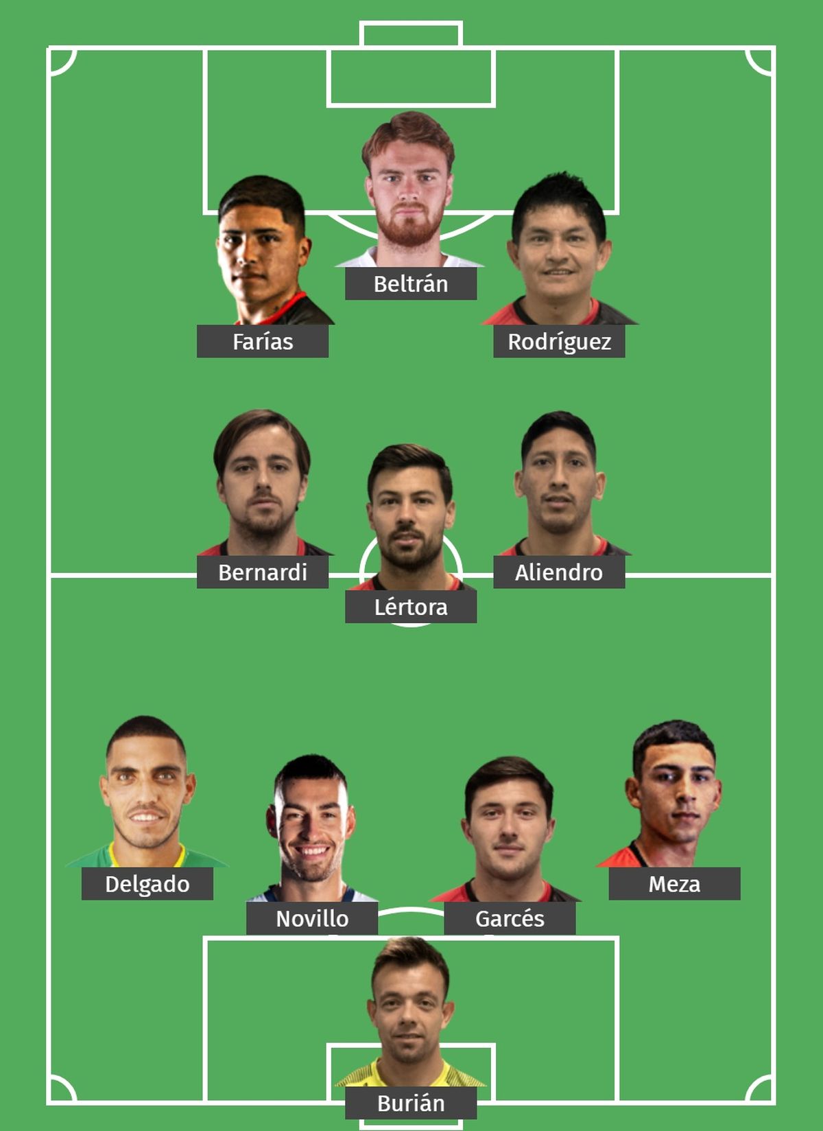 Con Leonardo Burián en el arco, el Emperador alineará en el fondo a: Eric Meza, Facundo Garcés, Joaquín Novillo y Rafael Delgado, formando en el medio a Federico Lértora, Rodrigo Aliendro y Christian Bernardi. En el ataque, donde aparece la principal novedad, Luis Miguel Rodríguez y Facundo Farías jugarían por detrás de Lucas Beltrán, componiendo así un tridente de ataque como pocas veces se vio en un equipo de Falcioni. Ramón Ábila esperará por minutos en cancha en el banco de suplentes.