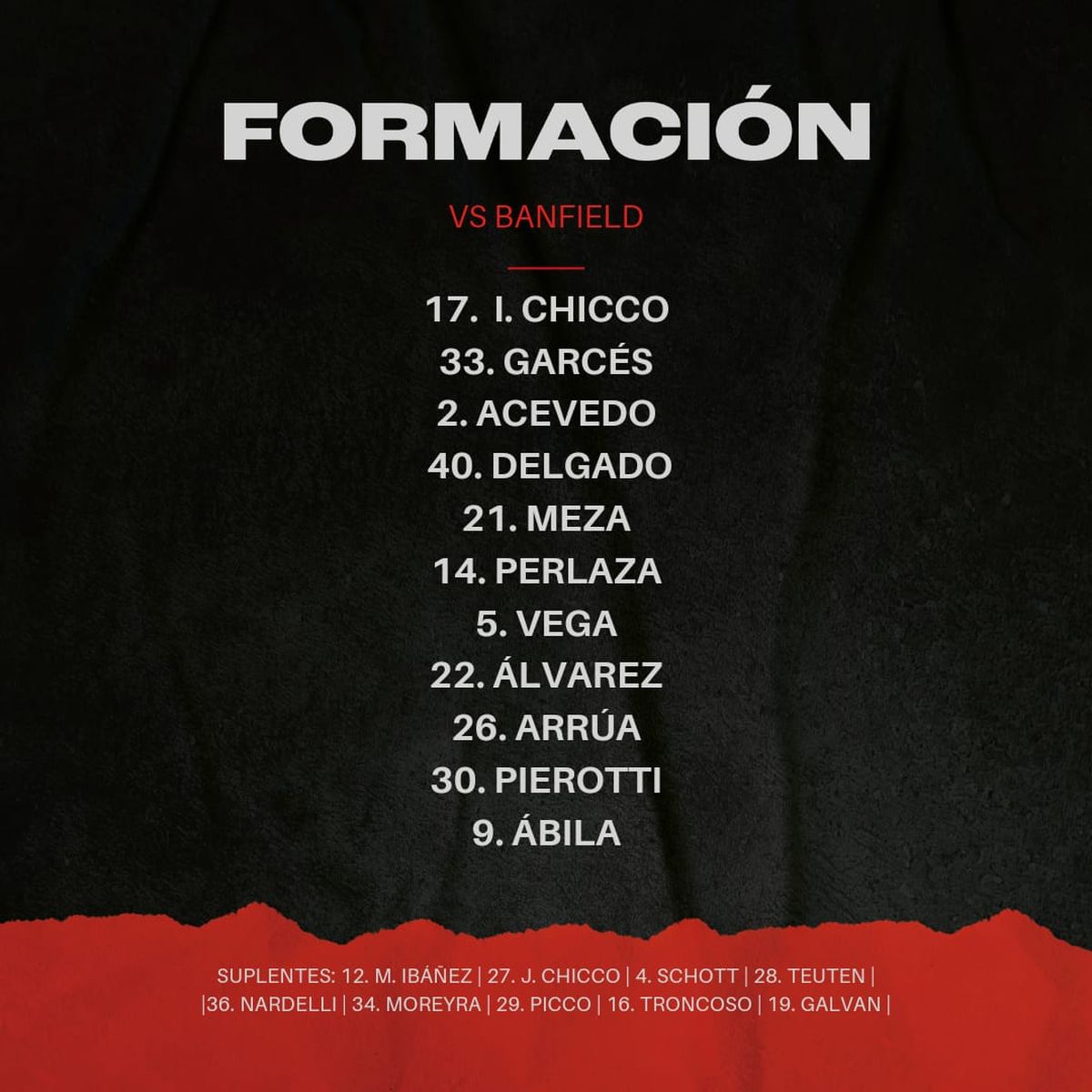 Banfield: Facundo Cambeses; Matías Romero, Alejandro Maciel, Emmanuel Olivera y Aaron Quirós; Pedro Souto, Eric Remedi, Alejandro Cabrera e Ignacio Rodríguez; Juan Francisco Bisanz y Andrés Chávez, Brahian Aleman o Milton Giménez. DT: Javier Sanguinetti.