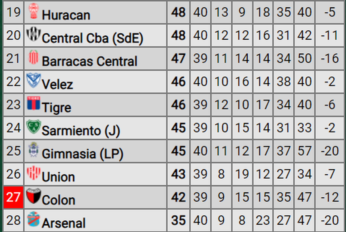 Arsenal ya descendió por la tabla de los promedios del descenso mientras que el segundo pasaje estará entre Colón, Unión, Gimnasia, Sarmiento y Vélez. Colón deberá ganarle a Talleres y definir con Vélez mientras que Unión tendrá que superar a Belgrano y definir de local ante Tigre.