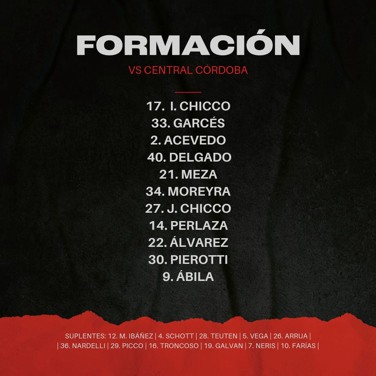 - Central Córdoba: Marcos Ledesma; Brian Blasi, Fabio Pereyra o Gonzalo Goñi, Gustavo Canto y Marcelo Benítez; Leandro Maciel y Enzo Kalinski; Lucas Gamba, Lucas Besozzi y Brian Farioli; Facundo Castelli. DT: Leonardo Madelón.