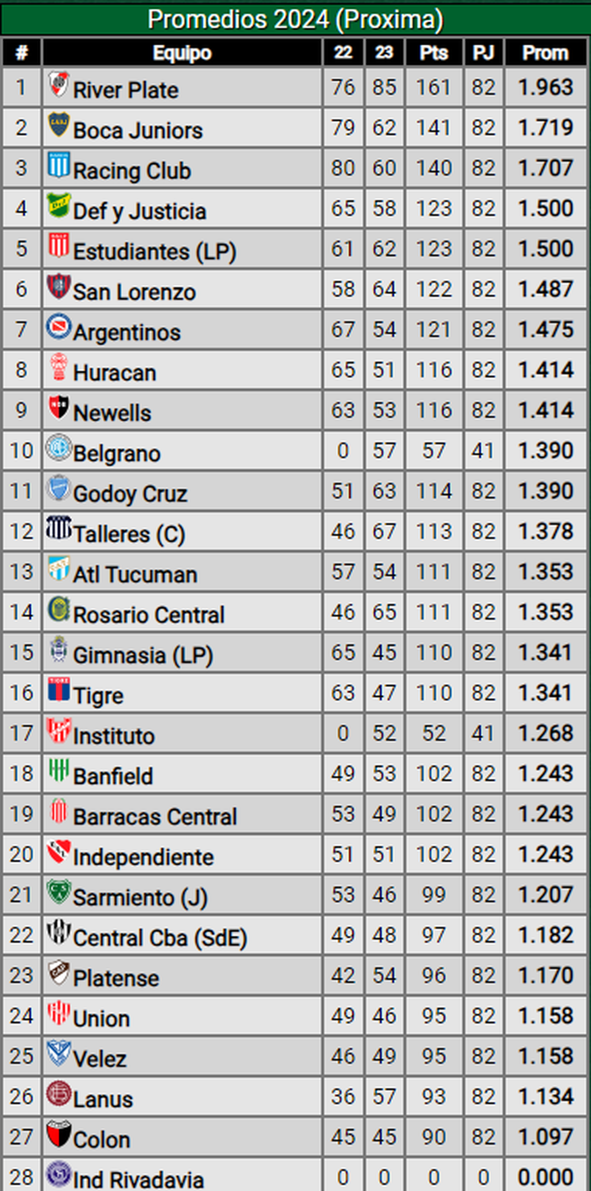 Colón y Gimnasia definirán el equipo el segundo descenso de la Copa de la Liga y no caben dudas que, si Colón es el que se queda en Primera, tendrá un durísimo 2024 respecto a los promedios, ya que comenzará en el puesto 27 y si los ascendidos tienen un buen año, será muy complicado que se quede en Primera. Tendría una lucha palo a palo con Lanús, Vélez y Unión.
