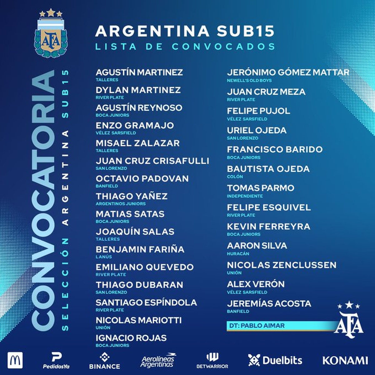 Los 29 citados son los arqueros Dylan Martínez (River), Agustín Reynoso (Boca), Enzo Gramajo (Vélez) y Agustín Martínez (Talleres, de Córdoba), y estos jugadores de campo: Misael Zalazar (Talleres, de Córdoba), Juan Crisafulli (San Lorenzo), Octavio Padovani (Banfield), Thiago Yáñez (Argentinos Juniors), Matías Satas (Boca), Joaquín Salas (Talleres, de Córdoba), Benjamín Fariña (Lanús), Emiliano Quevedo (River), Tiago Dubarán (San Lorenzo), Santiago Espíndola (River), Nicolás Mariotti (Unión), Ignacio Rojas (Boca), Jerónimo Gómez Mattar (Newell`s), Juan Cruz Meza (River), Felipe Pujol (Vélez), Uriel Ojeda (San Lorenzo), Francisco Barido (Boca), Bautista Ojeda (Club Atlético Colón), Tomás Parmo (Independiente), Felipe Esquivel (River), Kevin Ferreyra (Boca), Aaron Silva (Huracán), Nicolás Zenclussen (Club Atlético Unión, de Santa Fe), Alex Verón (Vélez y Jeremías Acosta (Banfield).