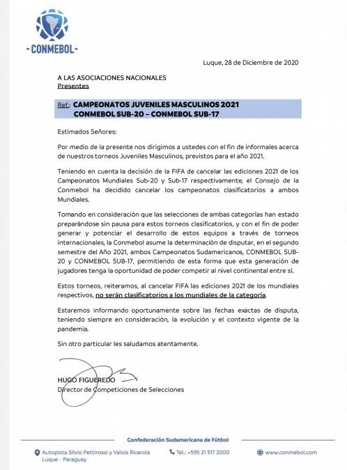 "Teniendo en cuenta la decisión de la FIFA de cancelar las ediciones 2021 de los Campeonatos Mundiales Sub 17 y Sub 20 respectivamente, el Consejo de la Conmebol ha decidido cancelar los campeonatos clasificatorios a ambos Mundiales", indica en un comunicado la Confederación Sudamericana de Fútbol.