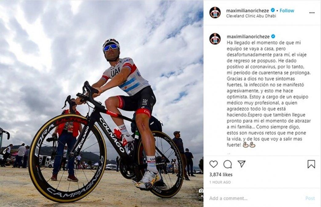 Richeze, miembro del equipo UAE Team Emirates, anunció la situación desde su cuenta oficial de Instagram en Abu Dabi, donde se mantendrá en cuarentena.