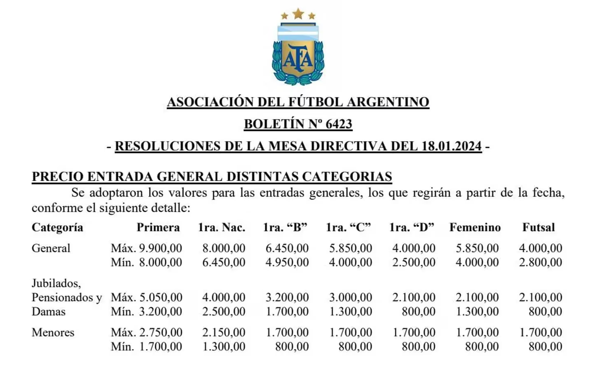 La Asociación del Fútbol Argentino decretó en reunión de la mesa directiva lo que será el nuevo precio mínimo y máximo para las entradas populares en cada una de las categorías que la componen, con un aumento con respecto a los últimos precios publicados en el pasado mes de agosto. ¿Cuánto deberá pagar el hincha de Colón y Unión?.