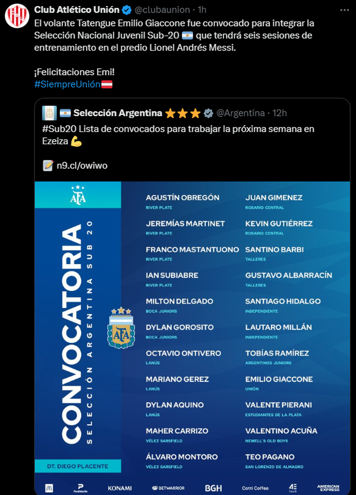 De Unión a la Selección Argentina: Diego Placente convocó a la Sub 20 a Emilio Giaccone