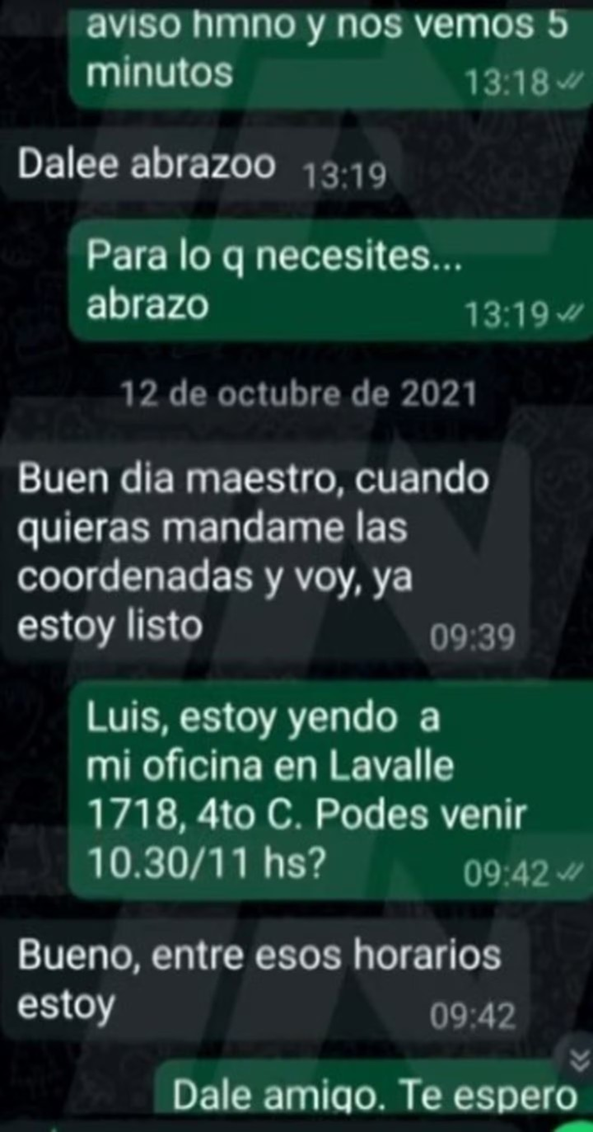 En esas conversaciones, fechadas en la previa de un partido de la Primera Nacional, se observa un intercambio entre Beacon y Lobo Medina en el que coordinan encuentros y mantienen un tono de cercanía. “Hola Luis, soy Juan Pablo Beacon. Amigo de Pablo”, inicia uno de los mensajes. La respuesta del árbitro: “Qué hacés querido. ¿Todo bien?”.