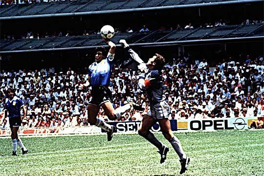 El primero de ellos debió haber sido anulado (Maradona metió con el puño un balón que disputaba al arquero británico), pero no por ello es menos famoso: al preguntársele después si había marcado el tanto con la mano, Maradona respondió que había sido "la mano de Dios", y con ese nombre pasó a la historia.