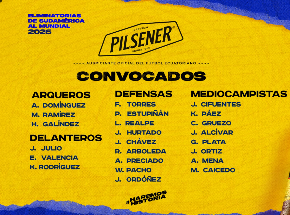 La Federación Ecuatoriana de Fútbol publicó una lista con 23 jugadores para afrontar las primeras dos fechas de las Eliminatorias Sudamericanas al Mundial 2026, donde enfrentará a la selección argentina, como visitante, y a la uruguaya, como local.