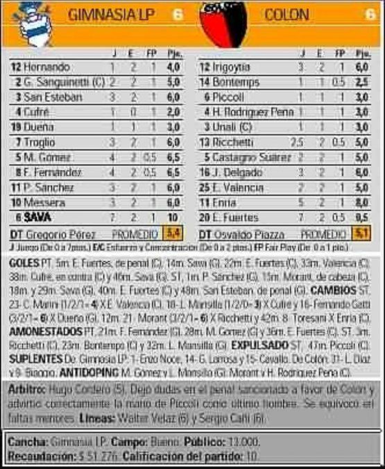 Gimnasia y Colón "se reventaron" a goles. 6 a 6 finalizó un encuentro que tuvo como goleadores a Facundo Sava por parte del Tripero con cuatro tantos -luego, este hombre sería entrenador de Unión el año 2013-; y Esteban Oscar Fuertes para Colón, que realizó un triplete. Quizás, quien más lamentó el resultado fue el conjunto sabalero, quien se había puesto 4 a 1 en el parcial durante el primer tiempo.