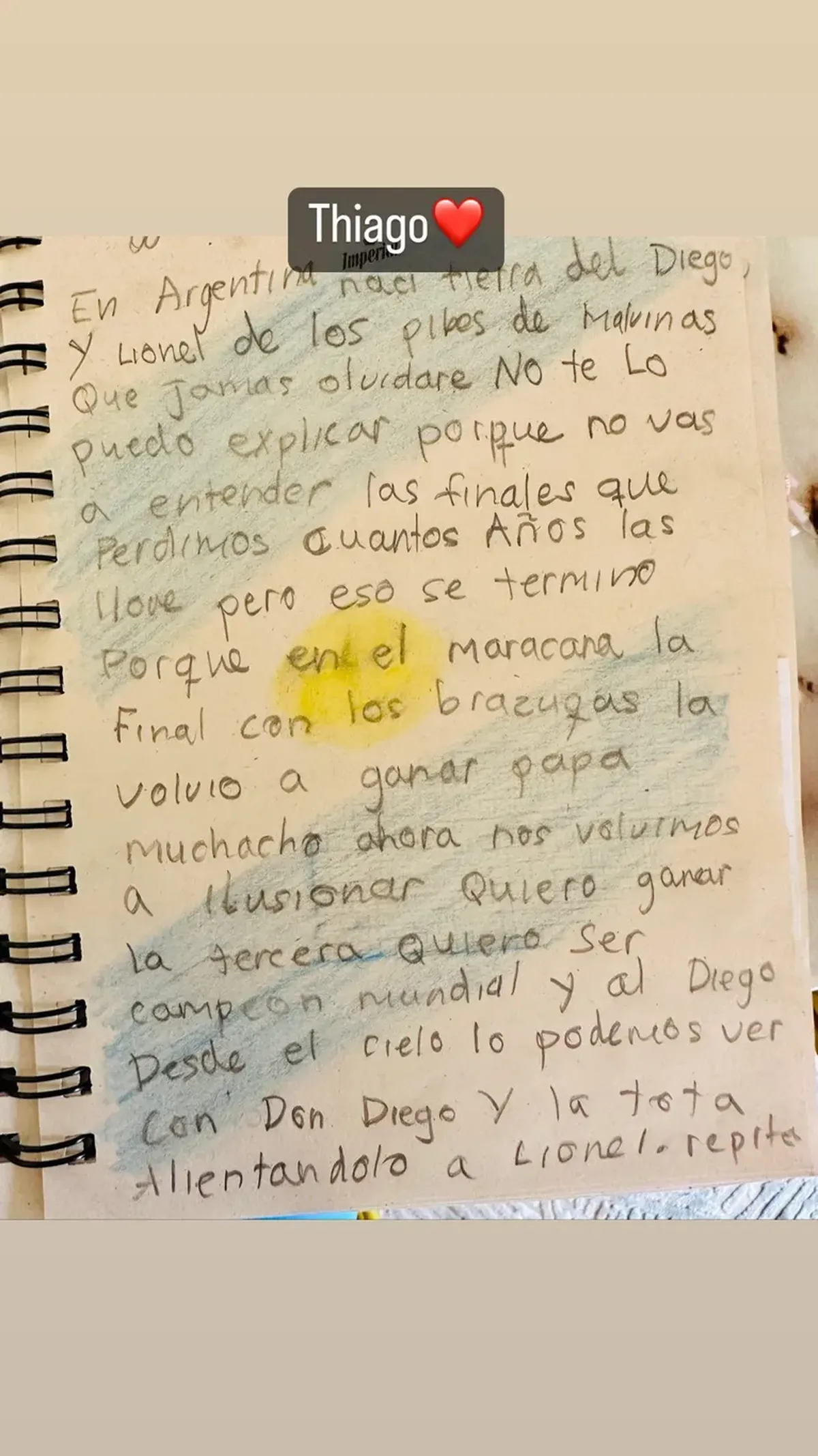 Thiago, el primogénito de Lionel y Antonela, se anotó en un bloc la letra de la canción que es sensación en este Mundial. La famosa "Muchacho", que lleva la melodía del clásico de La Mosca y que resonó en cada partido de la Scaloneta. Y su mamá, orgullosa de la pasión que le despierta la Selección Argentina, la compartió en una historia de Instagram.