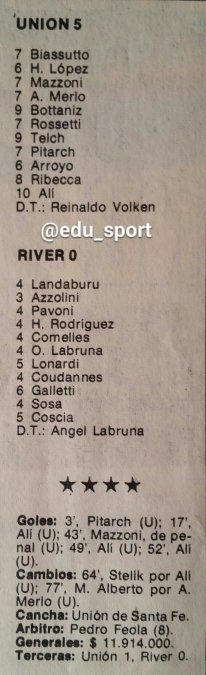 Síntesis del partido entre el Club Atlético Unión y River Plate, por el Torneo Metropolitano 1984