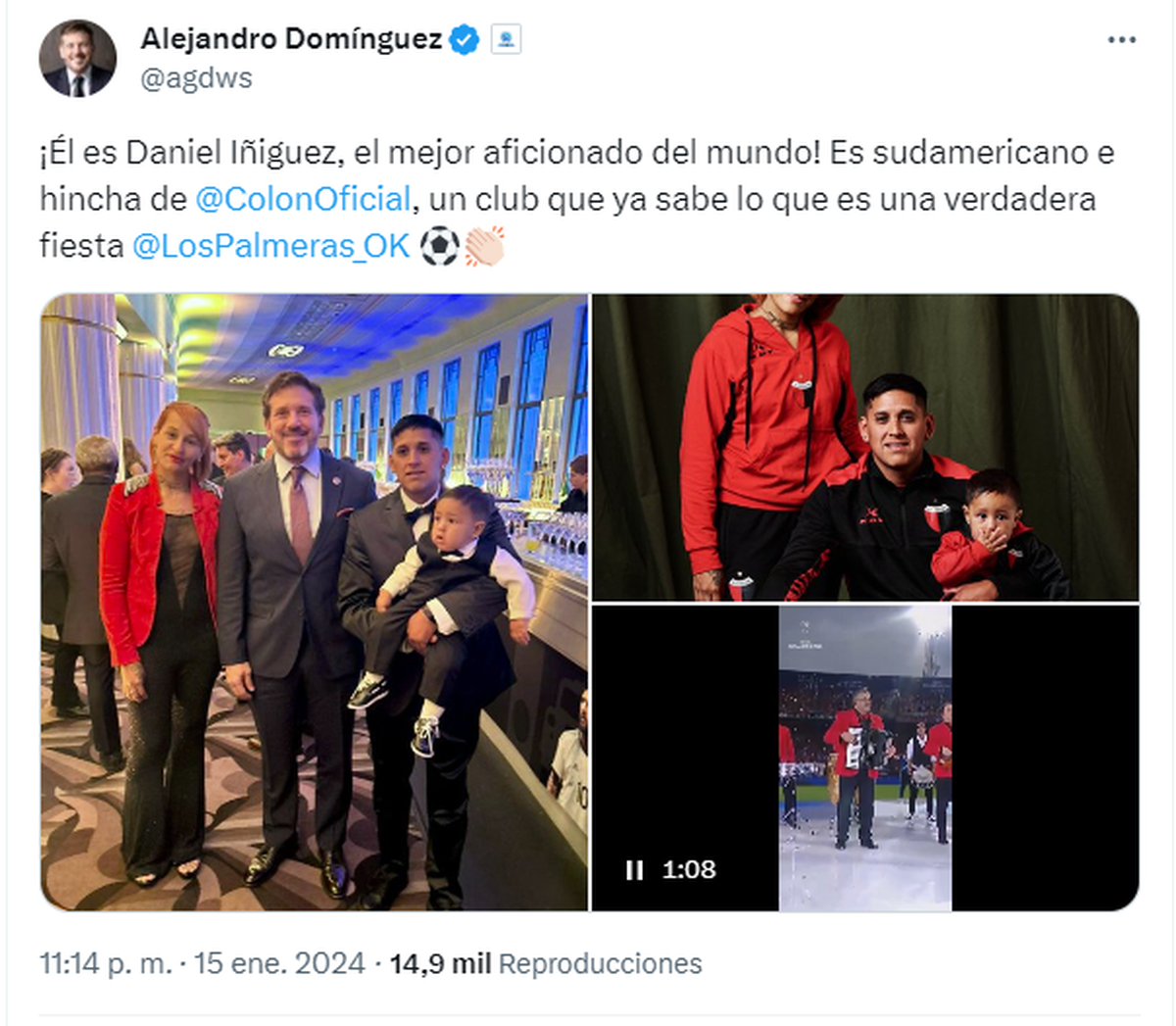 ¡Él es Daniel Iñiguez, el mejor aficionado del mundo! Es sudamericano e hincha de @ColonOficial, un club que ya sabe lo que es una verdadera fiesta @LosPalmeras_OK", posteó el ex presidente de Olimpia de Paraguay en sus redes sociales acompañado de una foto con el hincha y el recuerdo de la final.
