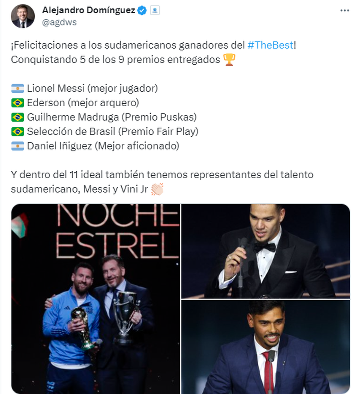 Entre los presentes en la gala de premiación estuvo Alejandro Domínguez, presidente de la Conmebol, quien finalizado el evento realizó un posteo en sus redes sociales mencionado a Colón, equipo que enamoró al dirigente paraguayo tras el subcampeonato de la Copa Sudamericana 2019.