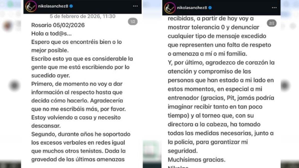 Luego detalló algunos otros hechos que venía padeciendo: “Durante años he soportado los excesos verbales en redes, igual que muchos otros tenistas. Dada la gravedad de las últimas amenazas recibidas, a partir de hoy voy a mostrar tolerancia 0 y denunciar cualquier tipo de mensaje excedido que represente una falta de respeto o amenaza a mí o a mi familia”.