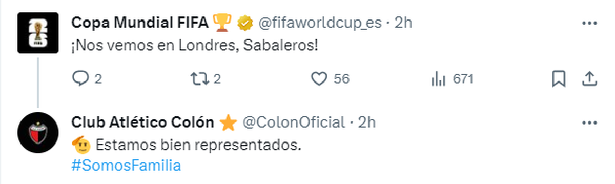 A tres días de la ceremonia, FIFA sorprendió en las redes sociales con un mensaje al club Colón tras un video publicado por el Sabalero referido a los premios The Best. "¡Nos vemos en Londres, Sabaleros!", le dijo la Federación Internacional de Fútbol Asociación al club santafesino.