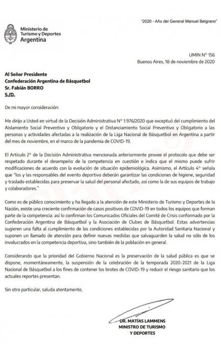 El texto remitido por el ministro Lammens al titular de la Confederación Argentina de Básquetbol (CAAB), Fabián Borro, da cuenta de la necesidad de interrumpir provisoriamente “la decisión administrativa N 1976/2020, que exceptuó del cumplimiento del Aislamiento Social Preventivo y Obligatorio y el Distanciamiento Social Preventivo y Obligatorio a las personas afectadas a la realización de la Liga Nacional de Básquetbol”, a partir del miércoles 4 del corriente mes.