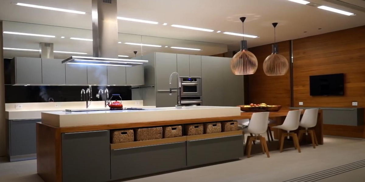 La mansión de Neymar en Brasil tiene una cocina americana equipada con electrodomésticos de última generación. La decoración matiza elementos minimalistas con otros más vanguardistas, como por ejemplo las lámparas de rafia.