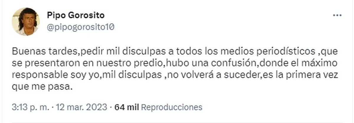 "Buenas tardes,pedir mil disculpas a todos los medios periodísticos ,que se presentaron en nuestro predio,hubo una confusión,donde el máximo responsable soy yo,mil disculpas, no volverá a suceder,es la primera vez que me pasa", publicó Pipo Gorosito en sus redes sociales excusándose por lo sucedido.