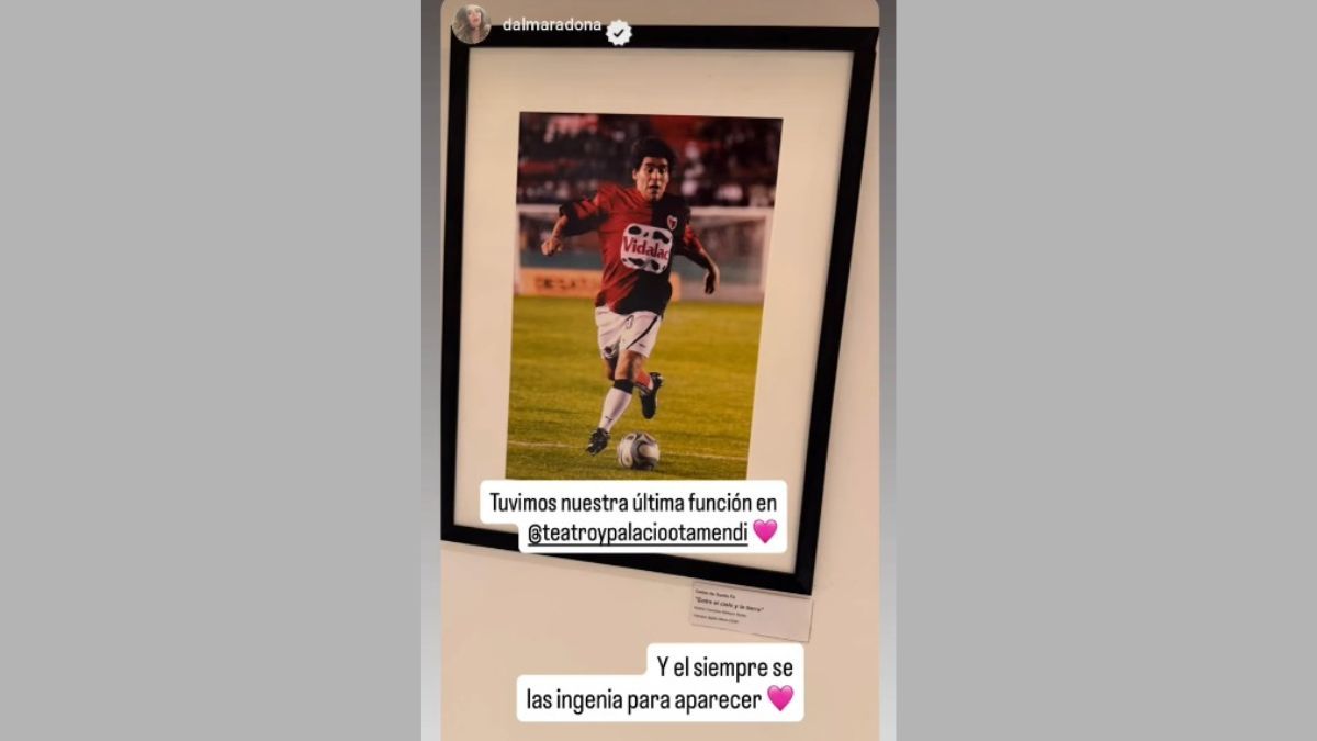 Y Dalma Maradona, luego de su obra, visitó la muestra y posteó una foto con un mensaje que llegó al corazón de los hinchas de Colón. "Tuvimos nuestra última función en el teatro y él siempre se las ingenia para aparecer", escribió sobre una foto de su papá en el estadio Brigadier López con la camiseta roja y negra que sacó con su celular y compartió en su cuenta de Instagram.