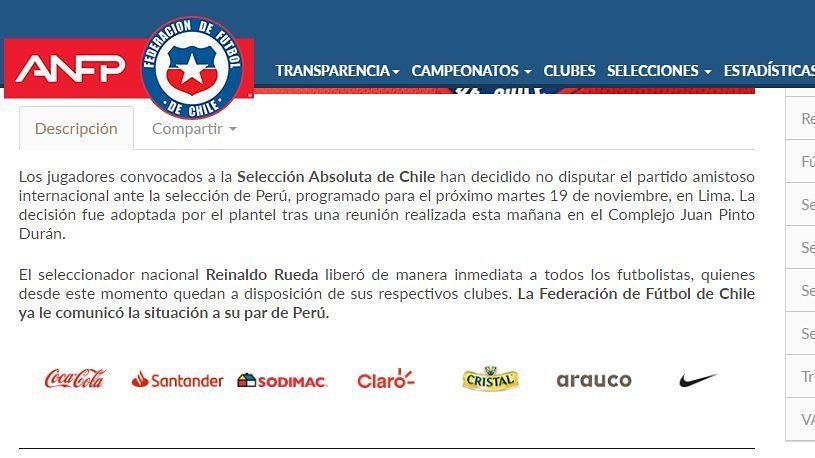 No obstante, la federación chilena afirmó en el comunicado que le avisó a sus pares de Perú la decisión de suspender el amistoso.
