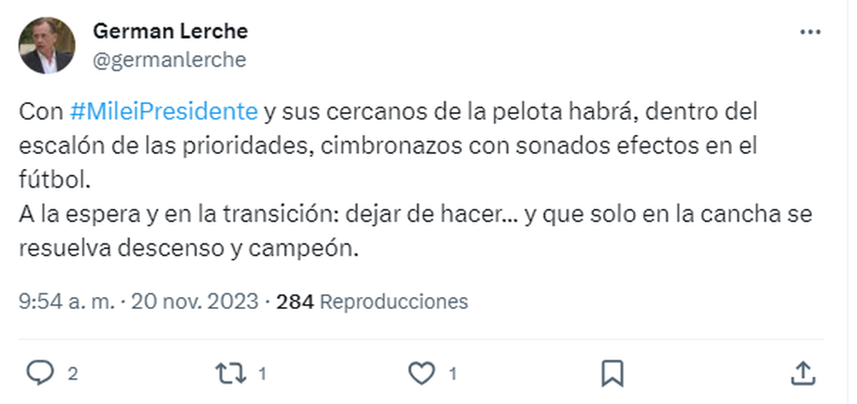 El ex presidente y ex secretario de selecciones nacionales, posteó: Con #MileiPresidente y sus cercanos de la pelota habrá, dentro del escalón de las prioridades, cimbronazos con sonados efectos en el fútbol. A la espera y en la transición: dejar de hacer... y que solo en la cancha se resuelva descenso y campeón.