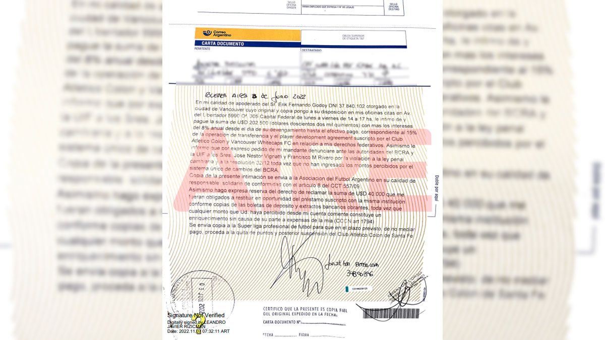 Si bien no es nueva, AIRE pudo acceder a una demanda millonaria al Sabalero por parte del exfutbolista de la institución, Érik Godoy, quien reclama a Colón y a la AFA como responsable solidario, el 15% de su pase tras la venta al Vancouver Whitecaps FC de la Major League Soccer.