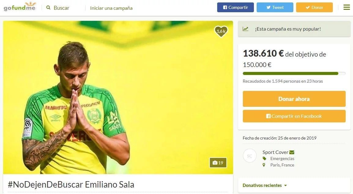 Un día después de que las autoridades dieran por finalizadas las tareas de búsqueda del avión que transportaba al delantero argentino Emiliano Sala, familiares, amigos, hinchas y futbolistas recaudan fondos para que reanuden los operativos.