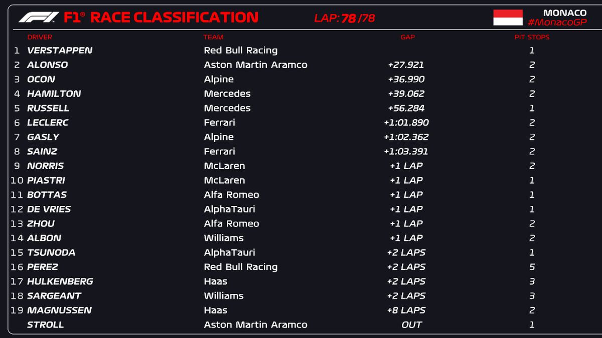 Max Verstappen ganó de punta a punta el Gran Premio de Mónaco, el sexto de la temporada 2023 de la Fórmula 1. Esta es su cuarta victoria en la temporada, lo que lo posiciona en el primer lugar del campeonato de pilotos, 39 puntos por encima de su perseguidor, Sergio 'Checo' Pérez, que completó un pésimo fin de semana. Fernando Alonso y Esteban Ocon se quedaron con el segundo y tercer lugar respectivamente.