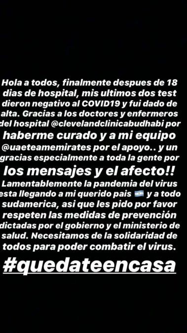 "Gracias a los doctores y enfermeros del hospital Cleveland Clinic Abu Dhabi por haberme curado y a mi equipo UAE Team Emirates por el apoyo... y un gracias especialmente a toda la gente por los mensajes y el afecto", agregó.