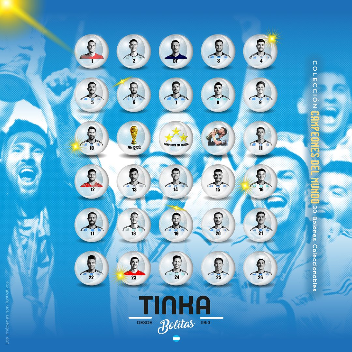 Las bolitas Tinka incluyen un total de 30 bolones, 26 cuentan con stickers que corresponden a los jugadores del plantel que consiguió la Copa del Mundo en el Mundial de Qatar 2022 tras ganarle en la final a Francia.
