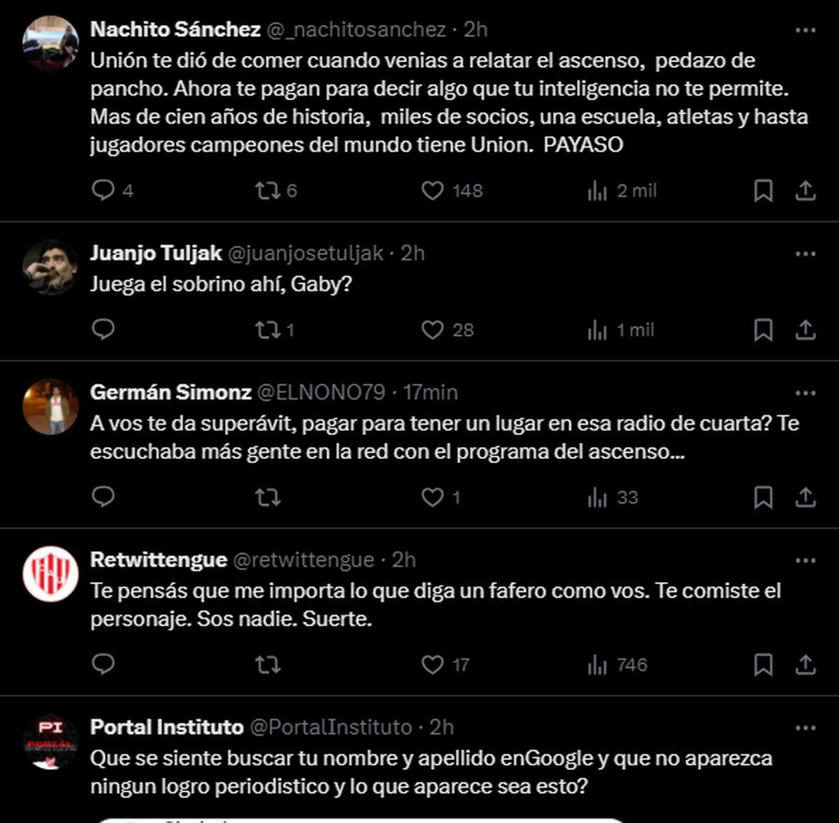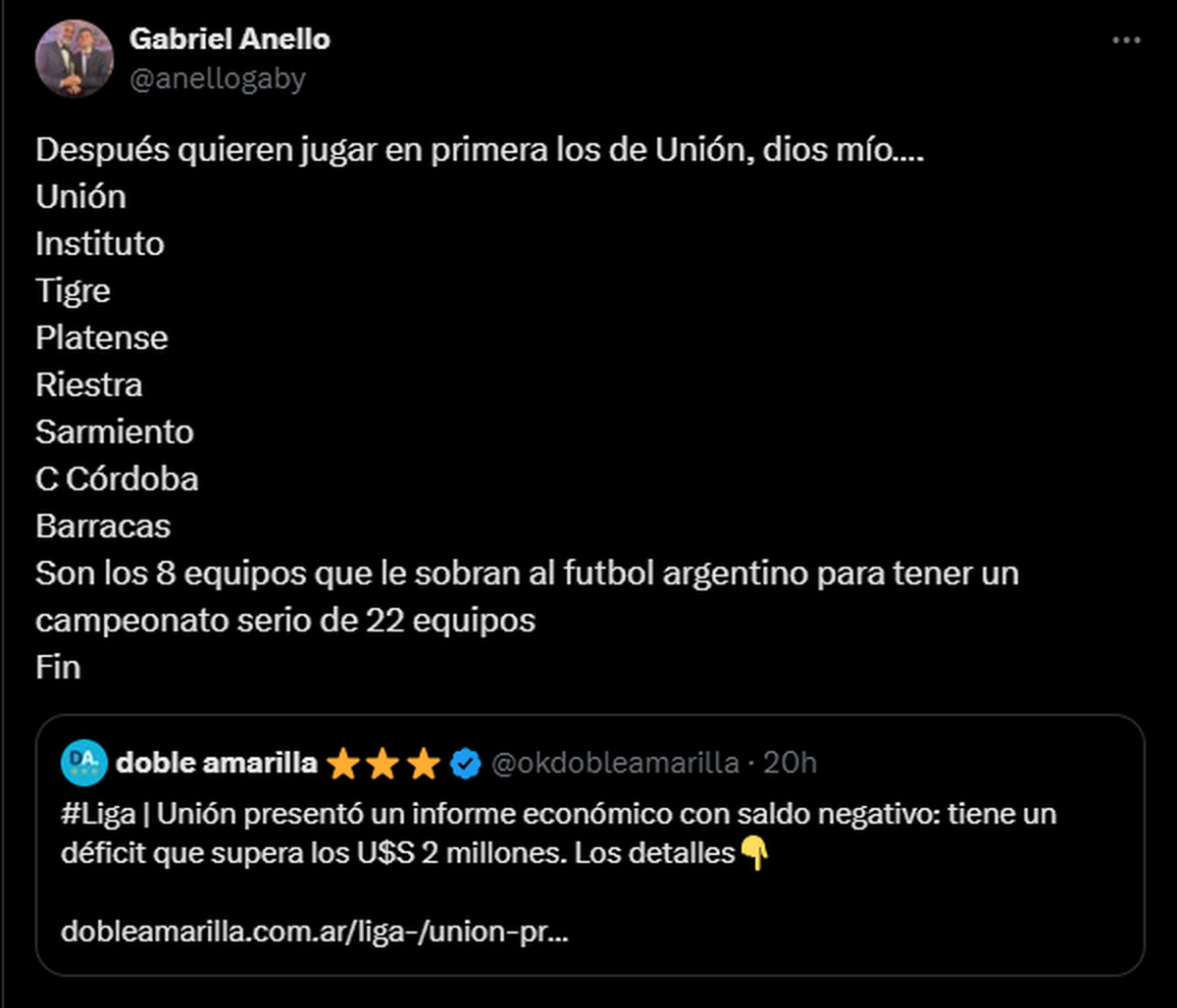 Tras el despectivo comentario de Gabriel Anello contra Unión durante su editorial en el programa de radio, el periodista redobló el mensaje y a través de sus redes sociales volvió a atacar a Unión, Tigre, Instituto, Barracas Central, Central Córdoba, Sarmiento, Riestra y Platense.