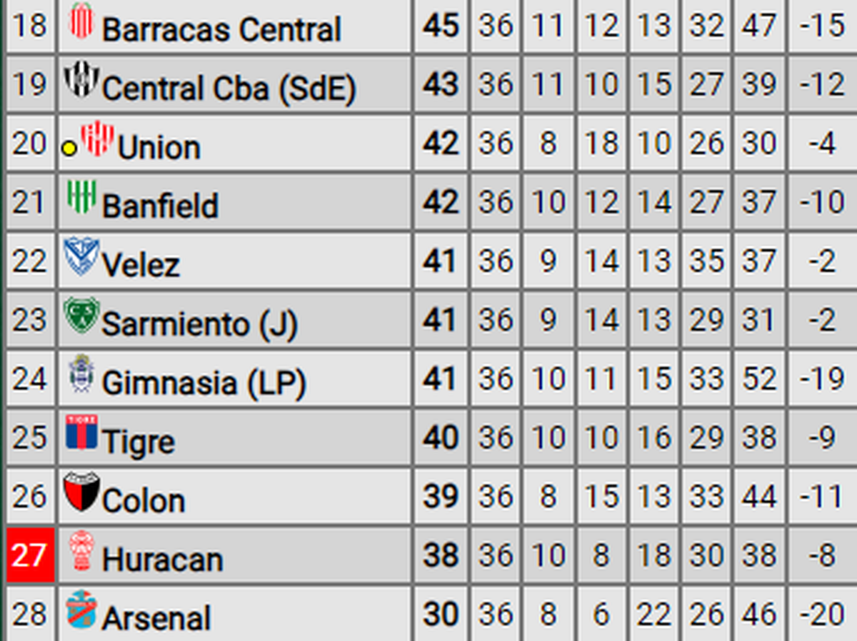 Con este resultado, el último y ya descenso es Arsenal con 30 puntos. El que le sigue, y hasta el momento perdiendo la categoría, es Huracán, que suma 38 puntos, mientras que Colón, con el empate ante River en Santa Fe, suma 39 unidades y por ahora se está salvando.
