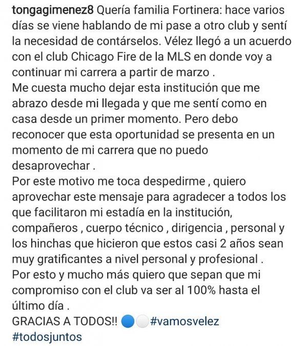 "Querida familia fortinera: hace varios días se viene hablando de mi pase a otro club y sentí la necesidad de contárselos. Vélez llegó a un acuerdo con el club Chicago Fire de la MLS en donde voy a continuar mi carrera a partir de marzo", expresó el futbolista en sus redes sociales.