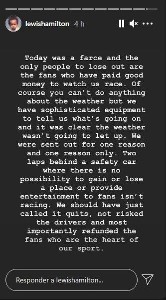 Luego, en su cuenta de red social Instagram, el campeón mundial en las temporadas 2008, 2014, 2015, 2017, 2018, 2019 y 2020, calificó lo vivido hoy en el autódromo de Spa-Francorchamps de “gran farsa”.