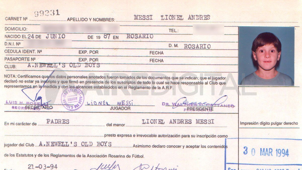 El 30 de marzo de 1994, Lionel Messi, como se ve en la foto de su carnet de liga, quedó oficialmente registrado en la Asociación Rosarina de Fútbol. Fue Newell's quien fichó al pequeño jugador con tan solo 6 años de edad, quien venía de destacarse en el Club Abanderado Grandoli.