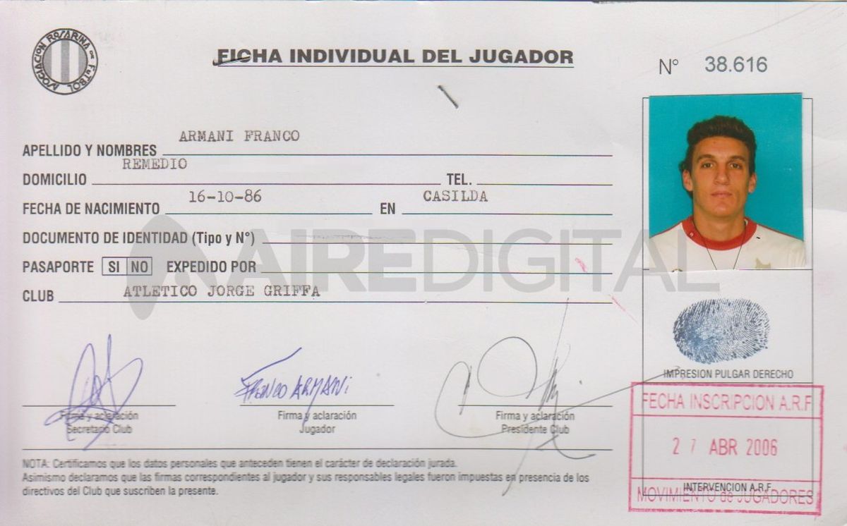 Franco Armani, el arquero de la Selección Argentina y actualmente en River Plate fue otro de los campeones de mundo que comenzó a jugar en las canchas de la Asociación Rosarina de Fútbol. Fue a partir del 27 de abril de 2006 cuando estampó su firma para el Club Atlético Jorge Griffa.