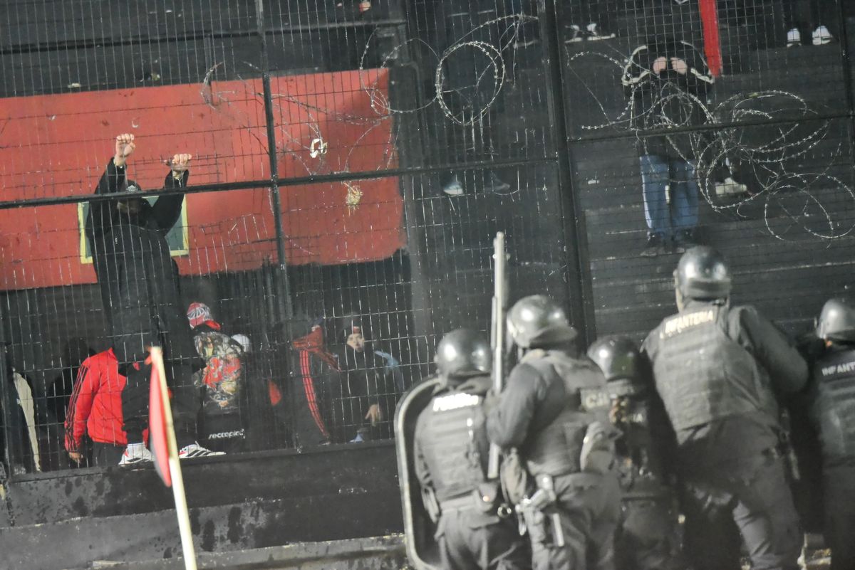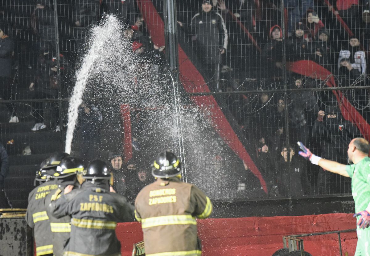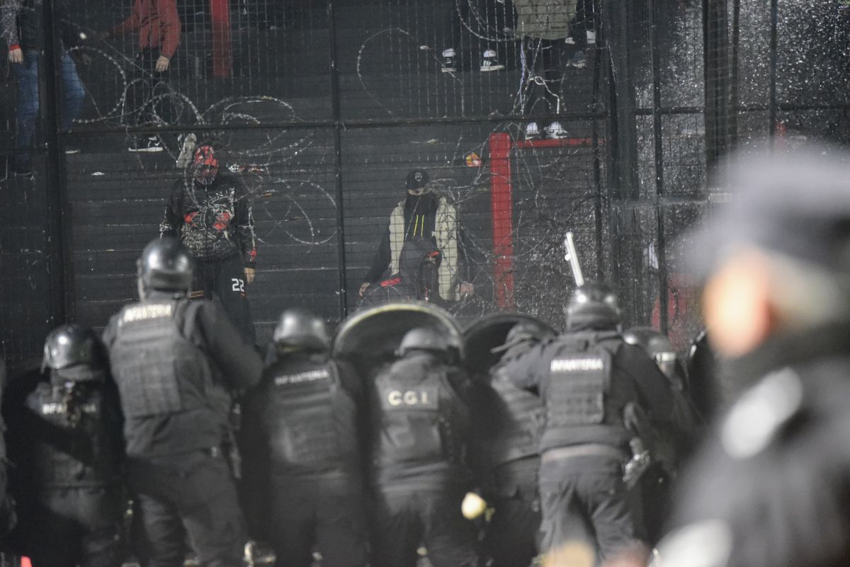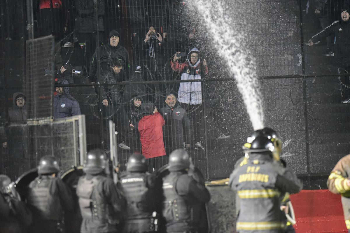 Además, los violentos rompieron parte del tejido, para acceder a la zona conocida como "el foso" y ubicarse a centímetros del campo de juego. El personal policial actuó rápidamente para evitar que esto suceda y también trabajaron los bomberos, arrojando agua a la tribuna. El público, arrojo piedras y botellas al campo de juego.