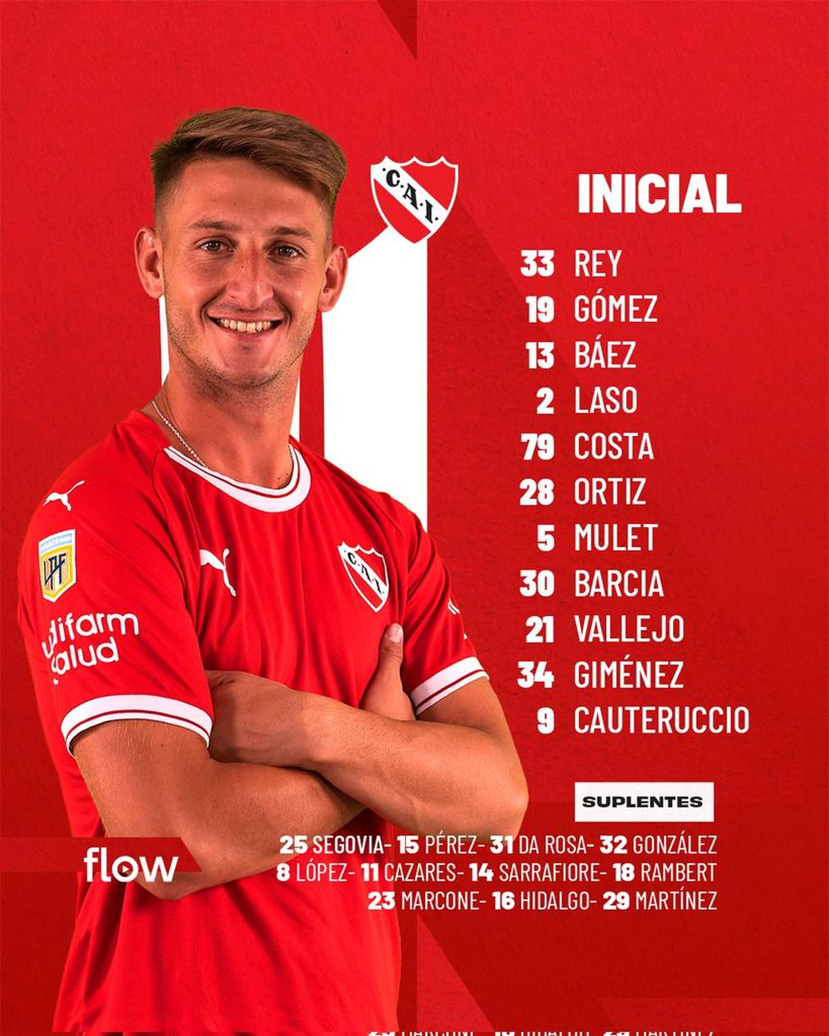 Independiente: Rodrigo Rey; Javier Báez, Luciano Gómez, Joaquín Laso y Ayrton Costa; Mateo Baltasar Barcia, Sergio Ortiz, Agustín Mulet y Javier Vallejo; Matías Giménez y Martín Cauteruccio. DT: Leandro Stillitano.